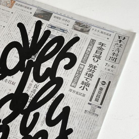 経済新聞にシルクスクリーンで”Over the Economy”とプリントされています。経済を越えてというアーティストのOKIならではのフレーズが落とし込まれたエディション作品です。