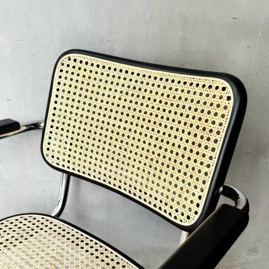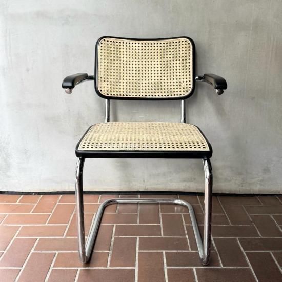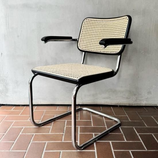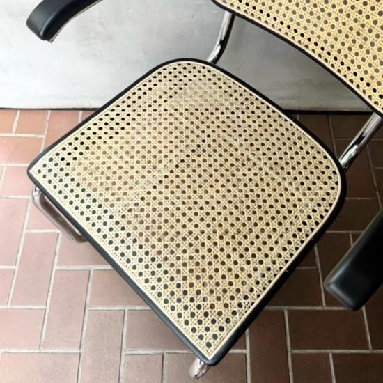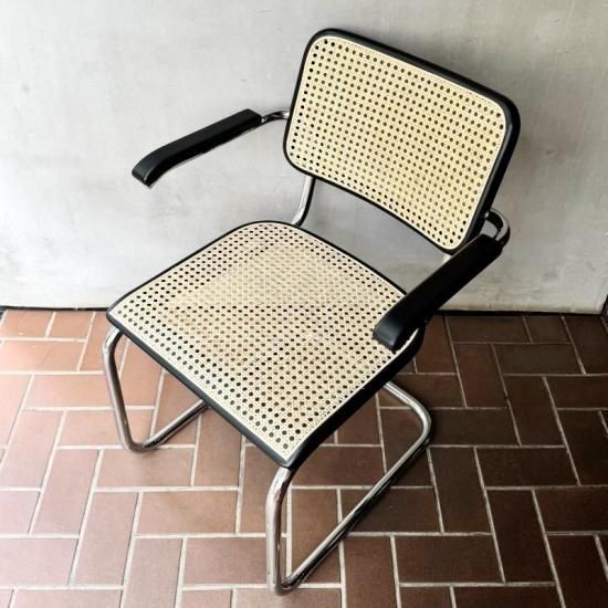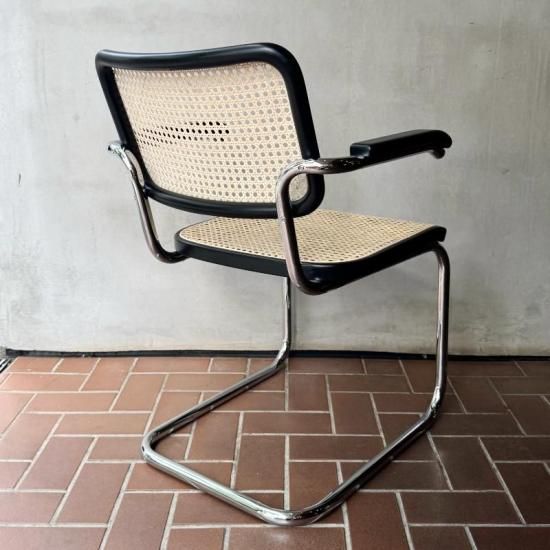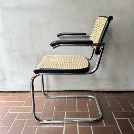 バウハウスで学び活躍したマルセル・ブロイヤーが1929年にデザインしたカンティレバー(構造)チェアの名作、トーネット社製S64の1970年代製のヴィンテージ。カンティレバー特有の軽くしなる座り心地はダイニングやデスク用のチェアに最適で、近年人気が再燃しているオススメの1脚です。フレームの前方に小傷はあるものの、ヴィンテージの雰囲気を損ねる程ではありません。背と座のラタンの状態はドイツにて新たに張り替え済みですので、長くご愛用頂けると思います。