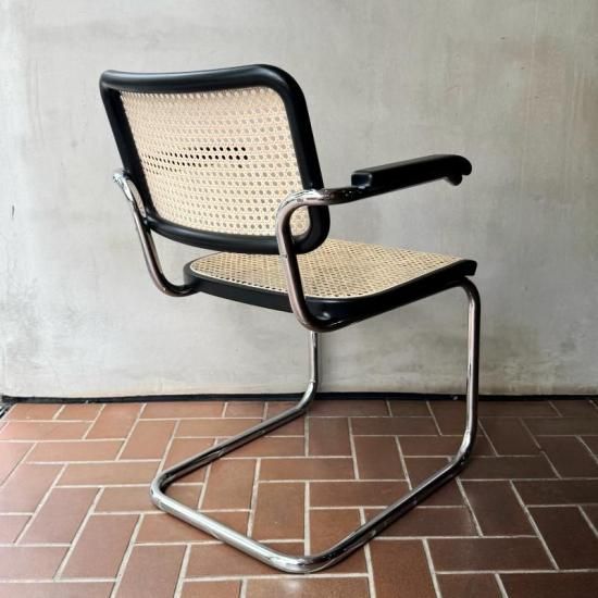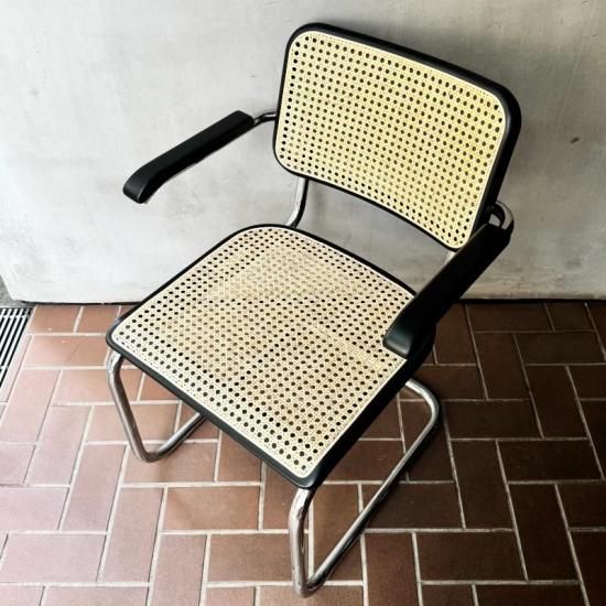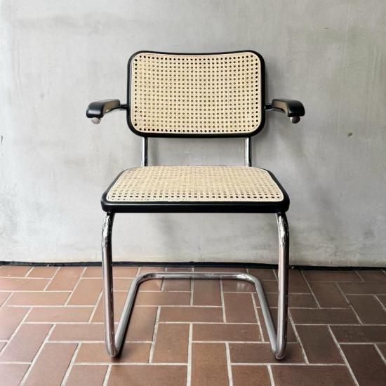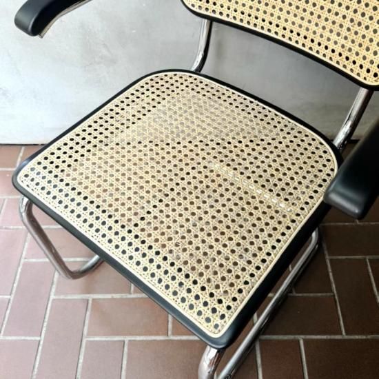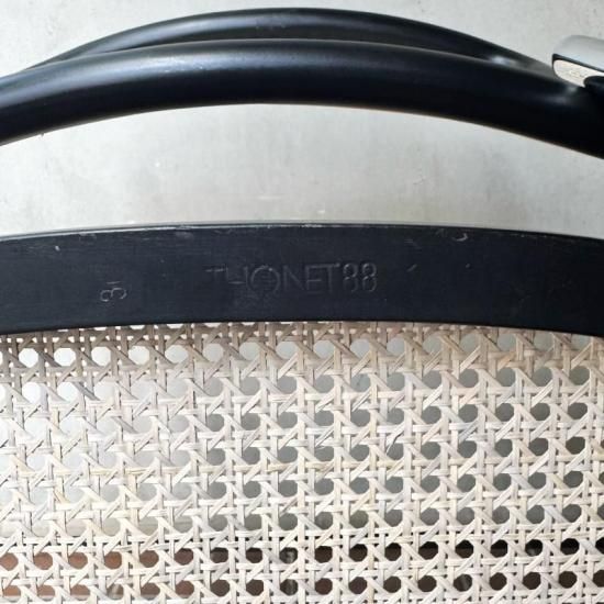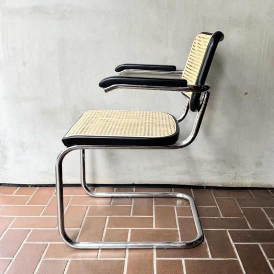 バウハウスで学び活躍したマルセル・ブロイヤーが1929年にデザインしたカンティレバー(構造)チェアの名作、トーネット社製S64の1988年代製のヴィンテージ。カンティレバー特有の軽くしなる座り心地はダイニングやデスク用のチェアに最適で、近年人気が再燃しているオススメの1脚です。フレームに小傷はあるものの、背と座のラタンの状態も良好ですので、長くお使い頂けそうです。
